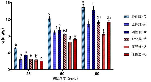 圖2:活性炭制備的雜化膜對(duì)汞(藍(lán)色條)和鉻(紅色條)的吸附能力。誤差線為標(biāo)準(zhǔn)偏差(n=3)。條上的不同字母表示基于最小顯著性差異(LSD)測(cè)試,p水平=0.05時(shí)不同處理之間的顯著性差異。