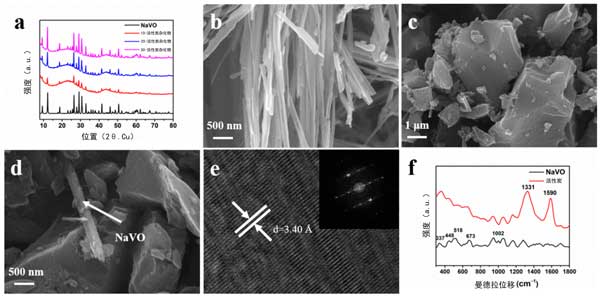 圖1:(a)NaVO和活性炭雜化物的XRD圖譜,(b–d)NaVO納米帶,活性炭和活性炭的SEM圖像,(e)NaVO納米帶的HR-TEM顯微照片,(f)NaVO和活性炭的拉曼光譜。