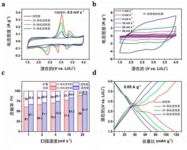 圖2:活性炭和活性炭雜化物在1.5至4V的半電池測試中的電化學(xué)性能。(a)所有樣品在0.5mV s-1的掃描速率下的循環(huán)伏安(CV)曲線,(b)活性炭雜化物1至50mV s-1之間的不同掃描速率下的CV曲線,(c)活性炭雜化物的擴(kuò)散控制法拉第過程和電容過程的貢獻(xiàn)率,(d)在0.05A g-1的電流密度下所有樣品的恒電流充/放電(GCD)曲線。