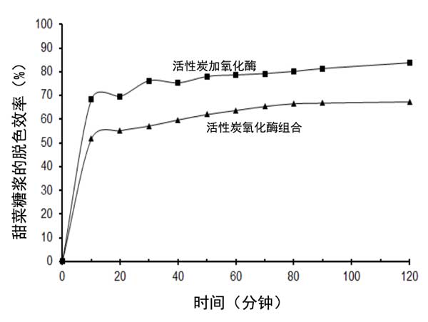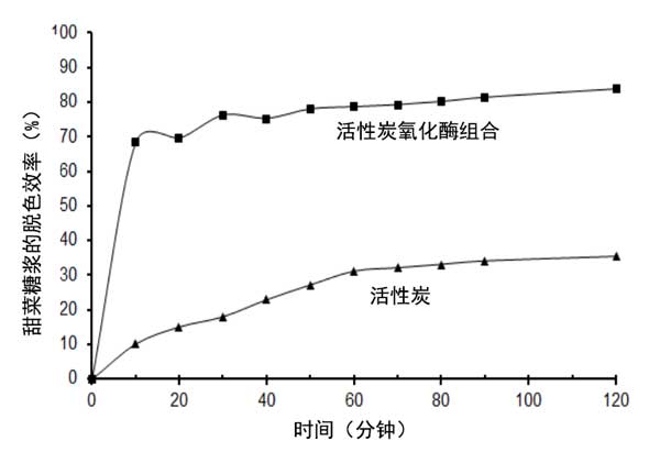 圖2:甜菜糖漿經(jīng)氧化酶固定的活性炭顆粒和組合的活性炭和氧化酶的脫色。