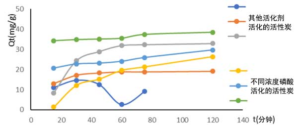 活性炭的吸附時(shí)間影響可從圖1看出,活性炭吸附分三步進(jìn)行:第一是在最初的30分鐘內(nèi),污染物的吸附量很快就被確定了,這可以用在吸附劑的外表面存在大量空置的結(jié)合位點(diǎn),這使得吸附劑易于吸附到該表面。第二在31分鐘后,吸附速率降低,過(guò)程緩慢;钚蕴康钠渌恢眠_(dá)到飽和后,污染物顆粒將遷移到吸附劑內(nèi)部。由于易于接近,因此吸附過(guò)程緩慢:顆粒內(nèi)擴(kuò)散。第三從80分鐘開始,我們觀察到一次接觸,活性炭已達(dá)到其最大容量。我們可以說(shuō)這些吸附劑的平衡時(shí)間是80分鐘。然而,磷酸活化的活性炭吸附量的演化曲線顯示,在最初的30分鐘內(nèi),污染物的吸附量顯著增加,此后,污染物的吸附量急劇下降,這將是一種產(chǎn)物解吸。這一現(xiàn)象在其他吸附劑中是不可見的,這可能意味著可用孔隙的數(shù)量和結(jié)合力隨著所用活化劑濃度的增加而增加,這一點(diǎn)還通過(guò)碘值和亞甲基藍(lán)的值進(jìn)行了驗(yàn)證。