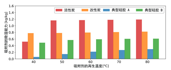活性炭的除濕能力可以定義為在給定溫度和濕度條件下的有效吸附量,其計算方式為吸附與解吸之間的平衡吸附之差?紤]到實際環(huán)境條件,相當(dāng)于室外空氣條件的吸附條件為干球溫度為32℃,相對濕度為80%。解吸條件是由再生空氣溫度從40℃到80℃給出的,室外空氣條件下的濕度比為24g/kg。計算出的除濕能力如圖1所示。比較了活性炭和典型硅膠(A型和B型硅膠)在不同再生溫度下的除濕能力。在硅膠的情況下,由于缺乏數(shù)據(jù),吸附和解吸之間的磁滯被忽略了,并且預(yù)期它很小。
