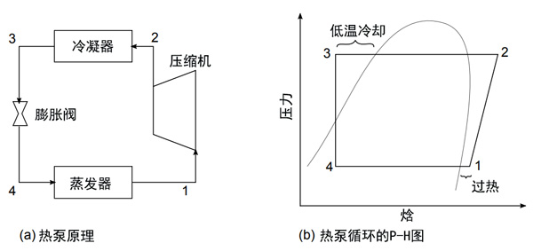 熱泵是空調(diào)的熱力學(xué)原理,可以基于狀態(tài)點的熱物理特性來預(yù)測熱泵的熱力學(xué)性能。圖2(a)顯示了典型熱泵的示意圖,圖2(b)顯示了壓力-焓線圖上的熱泵循環(huán)。在我們的模擬中,不僅計算了每種狀態(tài)下的熱物理性質(zhì),而且還計算了蒸發(fā)器和冷凝器中的熱交換過程。由于換熱器規(guī)格的可用性限制,所以將換熱器建模為雙管逆流式換熱器,該換熱器用于我們的實驗裝置中。