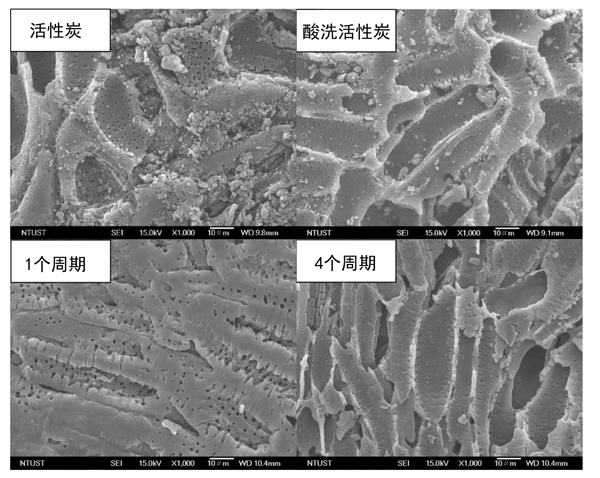 通過酸洗的活性炭和活性炭在顯示圖2中,SEM成像還透露,酸洗除去的雜質(zhì),從而產(chǎn)生的孔結(jié)構(gòu)具有一個看似光滑的表面。與原始活性炭相比,酸洗活性炭的比表面積和總孔體積略大。這可能是在酸洗過程中去除了其他化學物質(zhì)(例如氧氣)的影響。然而,酸洗似乎對活性炭的孔徑幾乎沒有影響。原始活性炭和新鮮活性炭的平均孔徑表明,絕大多數(shù)孔都屬于微孔范圍。