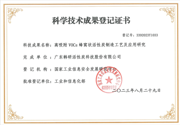 本次科學(xué)技術(shù)成果鑒定由國(guó)家工業(yè)信息安全發(fā)展研究中心依據(jù)《中華人民共和國(guó)科學(xué)技術(shù)進(jìn)步法》、《中華人民共和國(guó)促進(jìn)科技成果轉(zhuǎn)化法》、《科學(xué)技術(shù)評(píng)價(jià)辦法》、《科技評(píng)估管理暫行辦法》,在北京主持召開由韓研股份研發(fā)的“高吸附 VOCs 蜂窩狀活性炭制造工藝及應(yīng)用研究”科技成果評(píng)價(jià)會(huì)。期間嚴(yán)格按照《科技成果評(píng)價(jià)試點(diǎn)暫行辦法》的有關(guān)規(guī)定和要求,秉承客觀、公正、獨(dú)立的原則,聘請(qǐng)專家對(duì)該項(xiàng)科技成果進(jìn)行評(píng)價(jià)。評(píng)價(jià)委員會(huì)聽取了項(xiàng)目完成單位的技術(shù)總結(jié)報(bào)告,對(duì)評(píng)價(jià)資料進(jìn)行了審查,經(jīng)嚴(yán)格質(zhì)詢和充分討論形成一致意見:本技術(shù)成果達(dá)國(guó)際先進(jìn)水平。